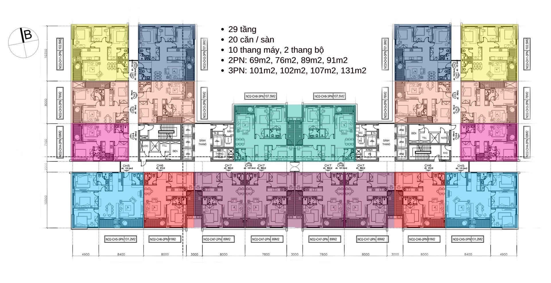🔰 Gồm 29 tầng nổi, 3 tầng hầm để xe. Tầng 1&2 là shophouse. Căn hộ ở từ tầng 3-29. Mỗi sàn 29 căn hộ với 12 thang máy, có thang vận chuyển rác riêng